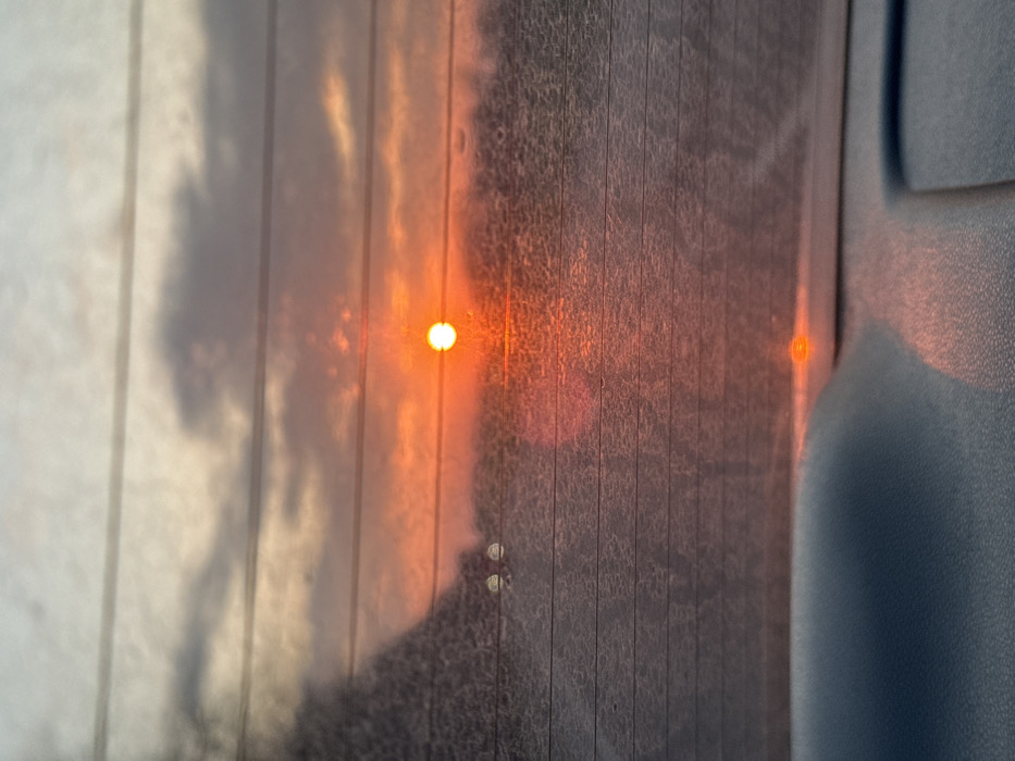 The image depicts an outdoor scene at either sunrise or sunset, viewed from inside a vehicle through a rear window