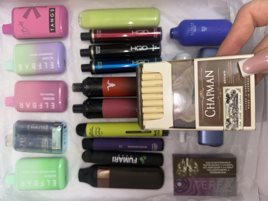- "The scene depicts an array of smoking and vaping products meticulously arranged on a plain white, soft-textured surface within an indoor setting in Yerevan, Armenia" by FM-7mQGh1, licensed under CC BY 4.0