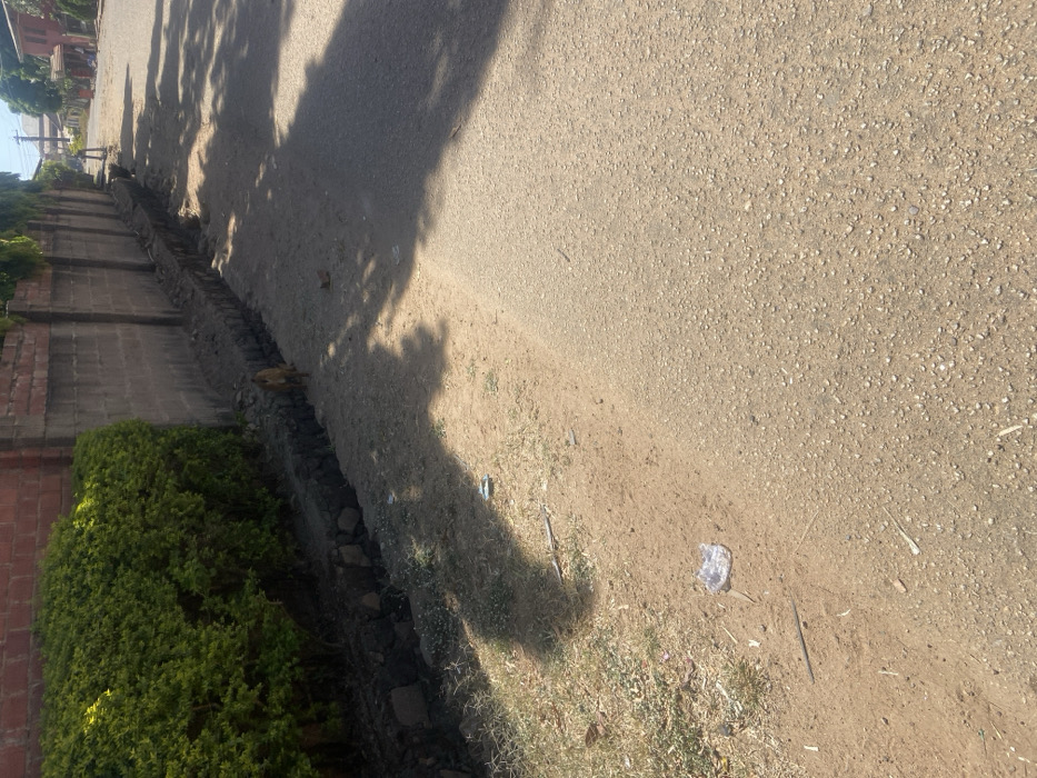 This image captures a sunlit residential street scene in Jos, Nigeria. The foreground features a light-colored, pebbled paved road on the right, transitioning to a lighter brown dirt shoulder on the left. The dirt shoulder contains scattered debris, including a crumpled translucent plastic bag and a dark elongated object, with sparse dry grass patches. Adjacent to the dirt shoulder, a shallow, partially stone-lined drainage ditch runs horizontally across the frame. Immediately behind this ditch, a dense, green hedge is visible, bordering a light-colored concrete block wall that is topped by a reddish-brown brick wall. A light brown, short-haired dog is present on the dirt shoulder, positioned in the mid-ground near the drainage ditch. The dog is facing away from the camera and appears to be walking towards the right side of the frame. In the mid-to-far background, the paved road continues into a residential area. A lone individual, dressed in light clothing, is faintly visible standing or walking on the far right side of the road. Further in the background, buildings with reddish roofs and various trees are discernible, along with utility poles. Distinct, dappled shadows from unseen overhead foliage are cast across the dirt shoulder and portions of the paved road, indicating a clear, bright day.