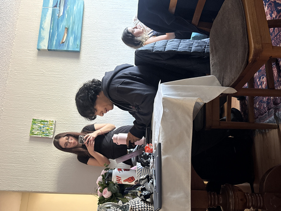 A vertically oriented shot shows three people, a woman in glasses taking a photo of a person in a black hoodie who is leaning over a table with a white runner. A painting of a boat and ocean hangs on the wall above. To the right, a second person sits in a chair, draped with a black coat and covered with a grey quilt. A small painting hangs to the left of the woman with glasses. The table is also decorated with a floral arrangement and a water bottle.