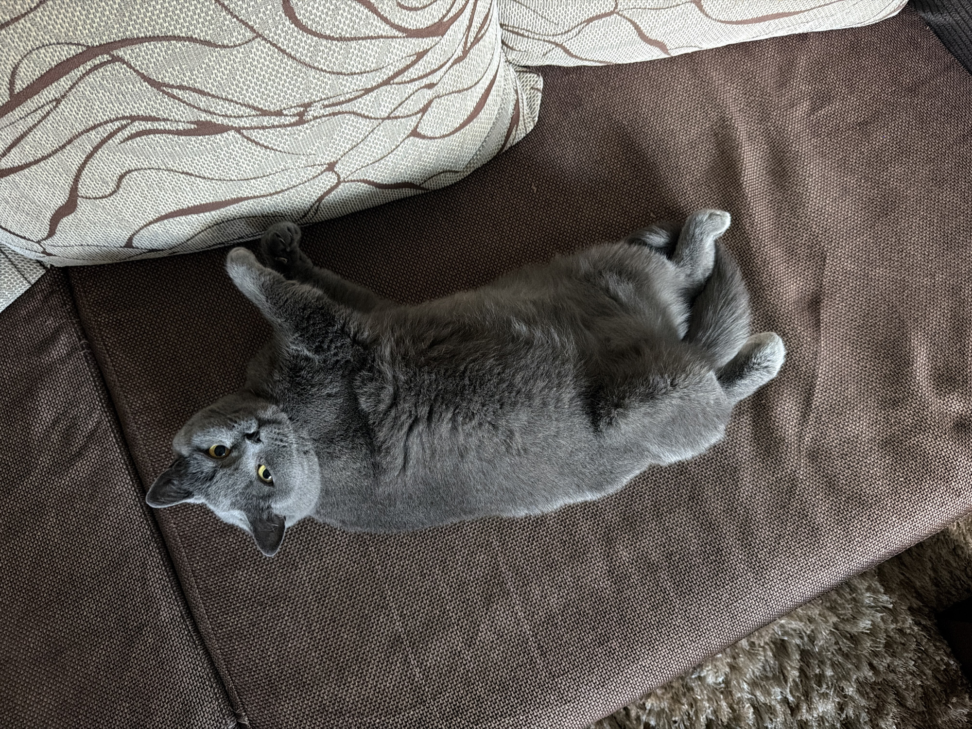 - "A gray cat is lying on its back on a brown upholstered sofa" by FM-rHl0I2, licensed under CC BY 4.0