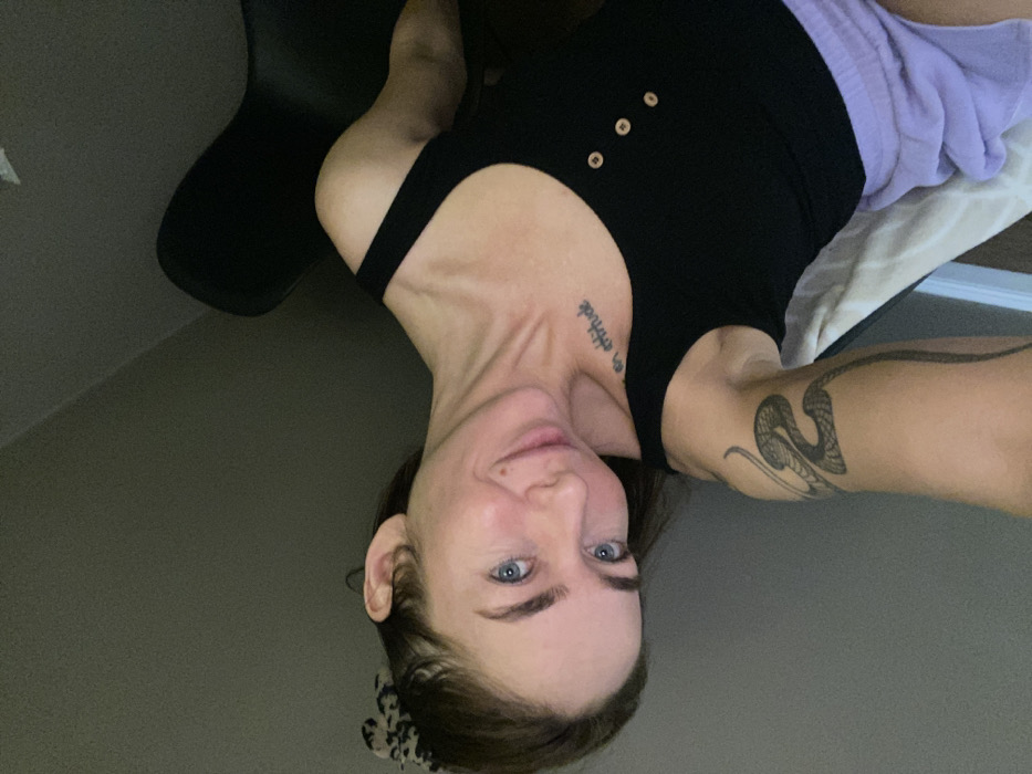 The image depicts a selfie of a female individual taken indoors, at a location identified as Ust-Ilimsk, Russia. No visual elements within the image confirm this specific geographic location. The subject, positioned with her head slightly tilted, is shown from the chest up, looking directly at the camera with a faint smile. Her dark brown hair is pulled back and secured with a leopard-print or spotted hair accessory. She has blue eyes and defined eyebrows. Two distinct tattoos are visible: text, partially legible as "an attitude," on her right upper chest/shoulder, and a prominent coiled snake design on her left upper arm. She is wearing a black, ribbed tank top with three light-colored circular buttons down the front placket. Light purple shorts are partially visible at the bottom right of the frame. The background consists of a dark grey wall, with a dark, indistinct furniture item (possibly a chair) visible in the upper right and a section of light-colored fabric or bedding in the lower right. The scene is illuminated by dim, indirect lighting.