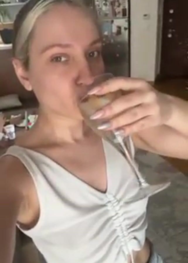 A fair-skinned woman with blue eyes and blonde hair partially pulled back drinks from a champagne flute in what appears to be her home