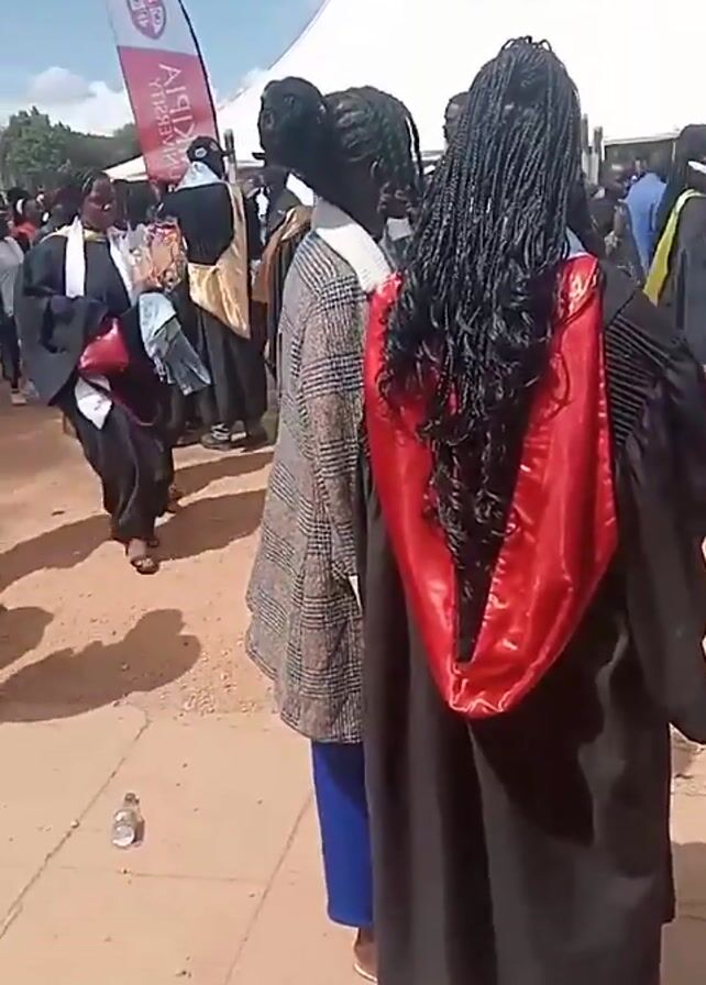 crowd of people, many wearing graduation gowns, gathered on a brick-paved area outdoors under a partially cloudy sky. A large white tent is visible in the background. People are walking around, and some appear to be talking to each other. There is a banner with an emblem and lettering visible on the left side. Debris such as an empty plastic water bottle can be seen on the ground. The camera angle is slightly low, following a woman with braided hair wearing a graduation gown with a red hood.