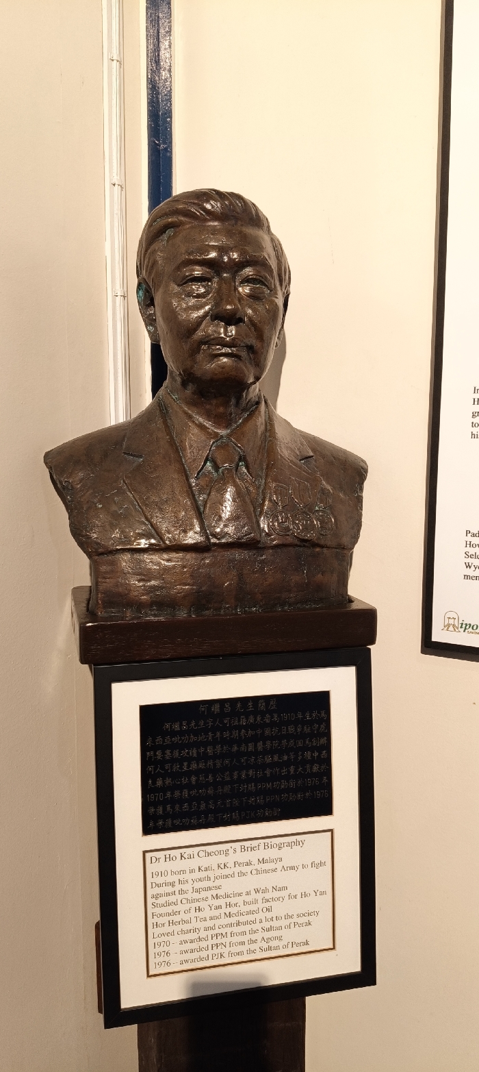 A bronze bust of Dr. Ho Kai Cheong is prominently displayed. Below it, a framed sign details his biography in both Chinese and English. The English text notes his birth in Kati, Perak, Malaya in 1910, his involvement with the Chinese Army during his youth, his studies in Chinese Medicine, his founding of Ho Yan Hor (known for herbal tea and medicated oil), his philanthropic contributions, and his awards, including PPM (1970), PPN (1976), and PJK (1976).