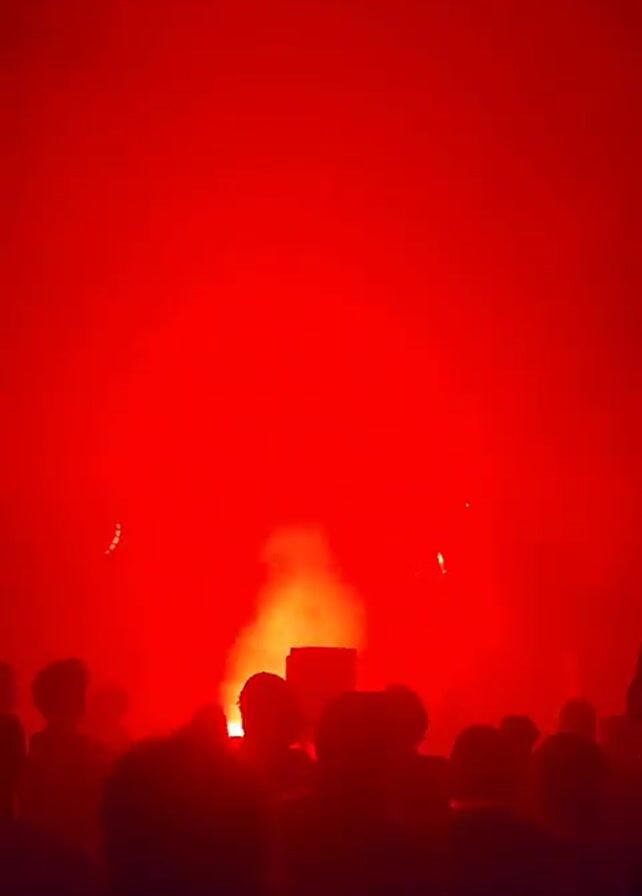 dark concert venue with a crowd of people watching a stage with a DJ or performer. The stage is illuminated by bright, shifting red lights and laser beams. The lights create a hazy, smoky effect, and the laser beams move across the stage and into the crowd. The people in the audience appear as dark silhouettes. There is electronic music playing.