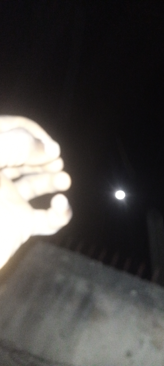 A blurry hand, illuminated from an unseen source, reaches towards a bright, out-of-focus moon in a dark night sky. A shadowy structure with corrugated elements appears in the foreground, also lacking sharp detail. The image suffers from poor focus and high contrast, with the moon being the only element that suggests depth.