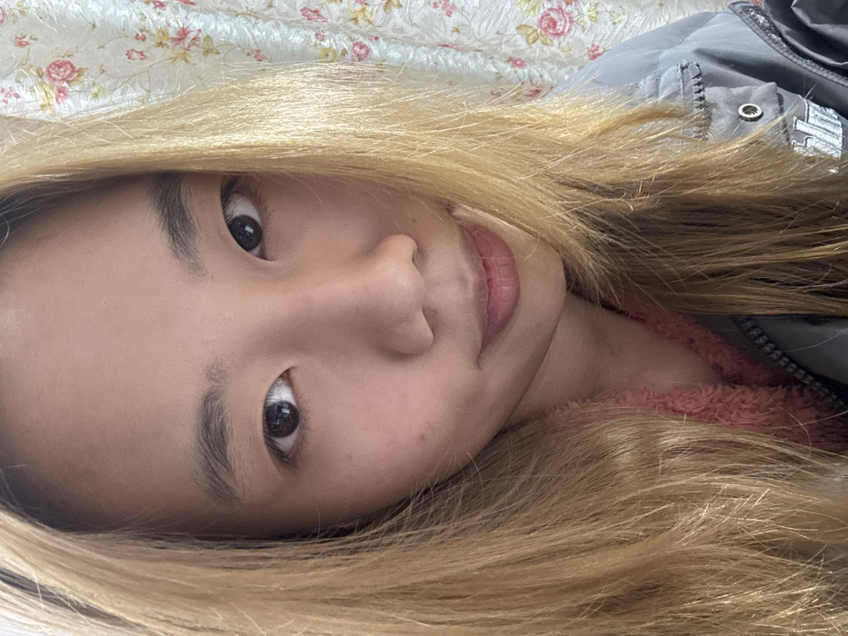 A female individual is depicted in a close-up, frontal portrait. Her complexion is fair, and her dark brown eyes are directed towards the viewer. Her eyebrows are dark and natural. Her lips are closed, forming a subtle, gentle smile. Her hair is long, straight, and dyed a light blonde or light brown color, framing her face and falling over her shoulders. She is wearing a grey zip-up jacket over a fuzzy, pink-colored garment visible at the neckline. A partial white logo or text is visible on the lower right portion of the grey jacket. The background consists of a light-colored fabric or wallpaper featuring a repeating floral pattern with pink roses and green leaves. The specific location within Shapingba District, China, cannot be determined from the visual information present in the image.