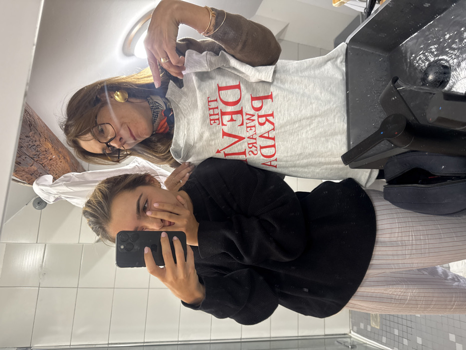 This image captures a mirror reflection of two females in an indoor setting, likely a bathroom, located in Villeurbanne, France. The foreground subject is a younger female, positioned on the left, holding a black multi-camera smartphone with her right hand to capture the reflection. Her left hand covers the lower portion of her face. She wears a black long-sleeved ribbed sweater and light-colored pinstriped trousers. Her hair is light brown and pulled back, and her fingernails are painted light pink. The background subject, an older female, stands to the right, with her left hand resting on the younger female's left shoulder. She wears glasses, a patterned neck scarf featuring blue, orange, and black, a light grey t-shirt with the reversed red text "THE DEVIL WEARS PRADA," and a brown long-sleeved shirt beneath it. She sports large gold-colored earrings, multiple rings on her left hand, and bracelets on her right wrist. Her right hand is raised, pointing towards her t-shirt. The environment reflected behind them includes white square wall tiles on the left. A clear glass shower partition is visible on the far left. A dark wooden beam is reflected in the upper center, and a white hooded garment hangs from a hook further back. A dark-colored rectangular basin or sink with a modern black faucet is present in the lower right, containing visible water droplets. A navy blue pouch or bag rests beside the sink.