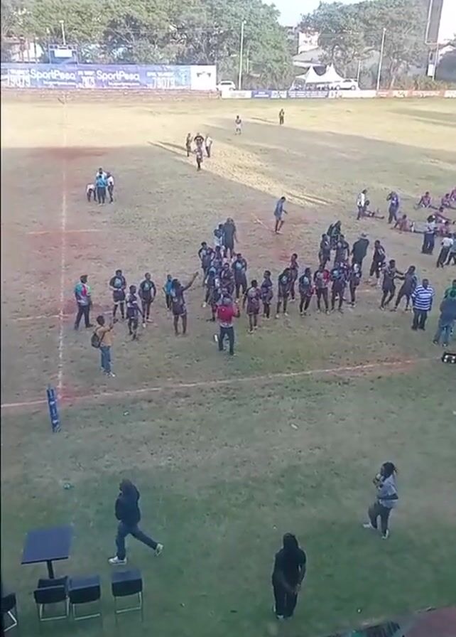 wide, long-distance shot of a sports field with a large group of people standing in the center. They appear to be a team or group of athletes, as they are uniformly dressed. People walk around them, some taking pictures with cameras or phones, and a few individuals are sitting on the grass around the field's perimeter. A table with chairs is set up in the lower left corner of the frame, just below the video’s perspective point. Trees are scattered behind the field, and in the background, there is a large advertisement banner labeled "SportPesa." Overall, the scene suggests a sporting event or gathering, likely a game or practice session.