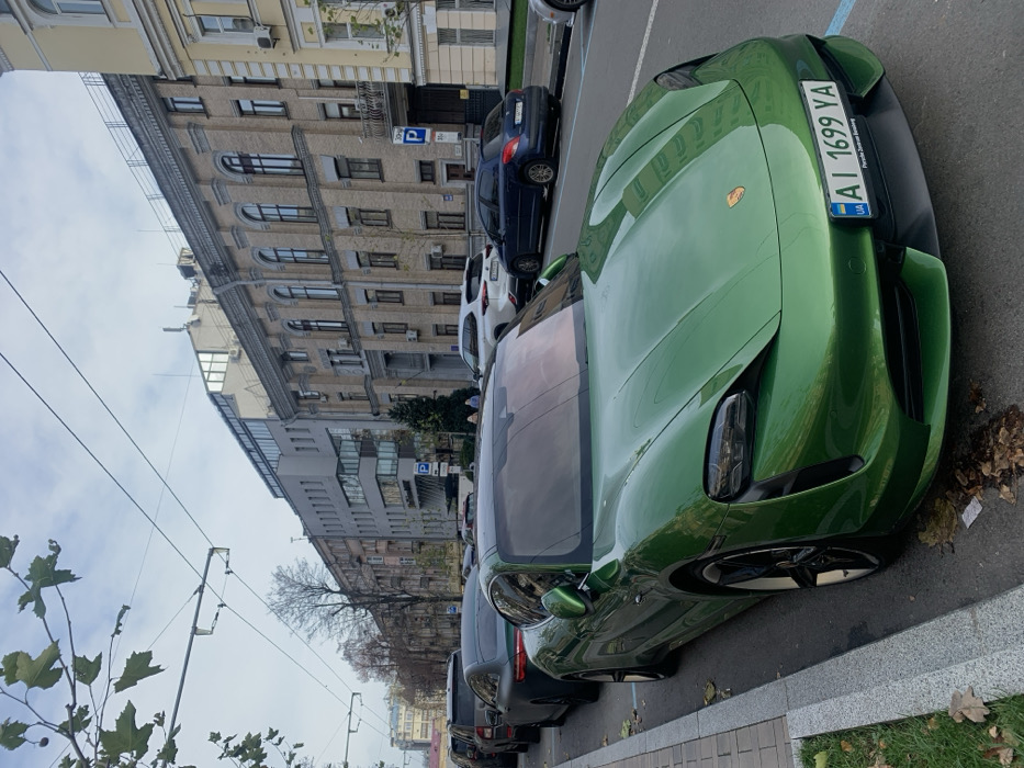 - "A bright metallic green Porsche Taycan electric sports car, bearing Ukrainian license plate AI 1699 YA with "Porsche Zentrum Beterlang" on its frame, is parked on the right side of Volodymyrska Street in Kyiv, Ukraine" by FM-BI1Cp2, licensed under CC BY 4.0