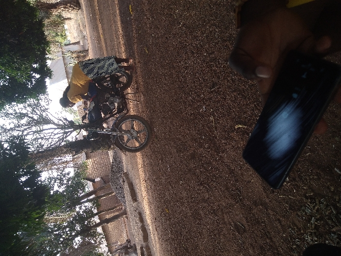 A person in a yellow shirt and patterned skirt works on a motorcycle in a rural setting. Trees and buildings border a dirt road. In the foreground, a person's hand holds a smartphone with a heavily scratched screen. The phone’s reflection obscures the display. The overall image is slightly rotated.
