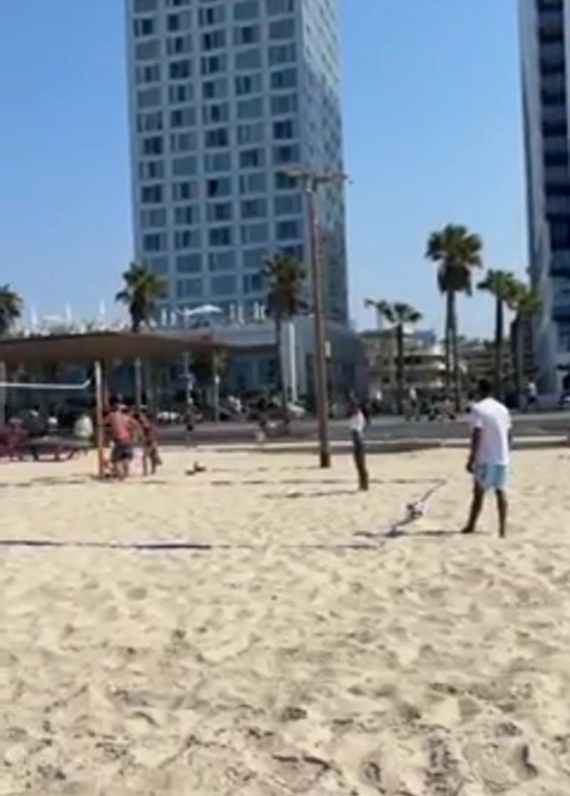 beach volleyball court set up on a sandy beach. People are playing volleyball on the court. Two tall, modern buildings are visible in the background. Palm trees line the walkway behind the beach, and a few people are walking along it. The sky is clear and blue, indicating a sunny day.