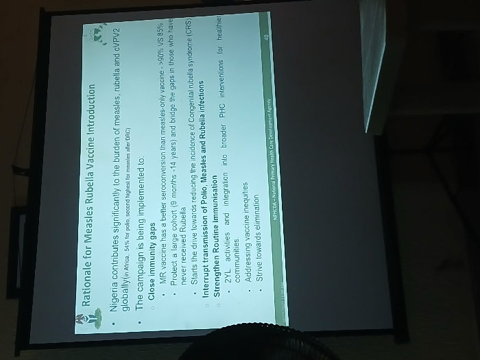 The image displays a projected presentation slide on a white screen within an indoor setting in Makurdi, Nigeria. The exact venue within Makurdi is not specified in the image. The slide is titled "Rationale for Measles Rubella Vaccine Introduction" and details Nigeria's contribution to the global burden of measles, rubella, and cVPV2, along with the objectives of a campaign to close immunity gaps, interrupt transmission of Polio, Measles, and Rubella infections, and strengthen routine immunization. The bottom of the slide identifies the "NPHCDA - National Primary Health Care Development Agency" and the slide number "40". A timestamp "10/11/2023 11:05 AM" is visible on the projected area. Partially visible on the left is a black electric fan with a circular grill. On the right, a segment of a light-colored table with a dark surface is visible. No individuals are present in the frame. The room is dimly lit, focusing attention on the projected content.