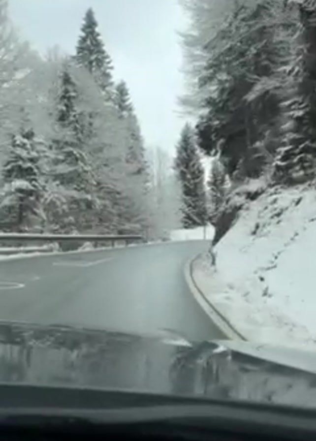 A driver's perspective video shows a vehicle traveling on a winding, paved road through a snow-covered forest