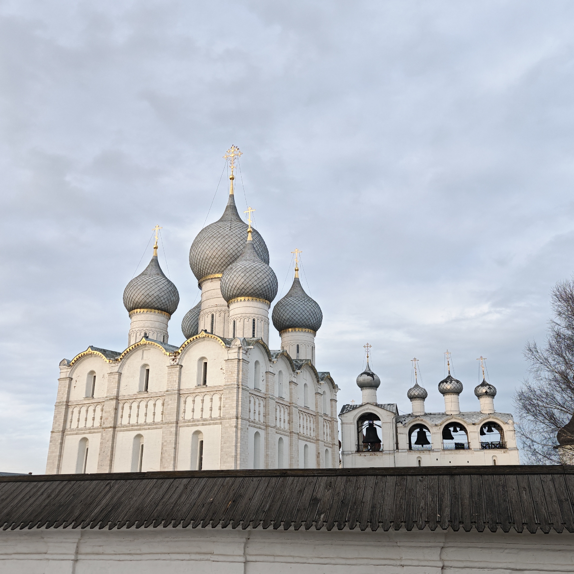 An exterior shot displays an architectural complex under an overcast, light gray sky. In the midground, a prominent white stone building, likely a cathedral or church, features five large, textured gray onion domes with gold trim at their bases, each surmounted by a golden Orthodox cross. The central dome's cross is more intricate. The building exhibits multiple levels, arched windows, and decorative cornices. To the right of this structure, a white belfry or bell tower extends upwards, characterized by several arched openings, at least three of which house large, dark bells. This belfry is also topped with smaller gray onion domes, each with a golden cross. In the foreground, a dark gray wooden roof, constructed from overlapping planks and featuring a distinctive scalloped lower edge, rests atop a white masonry wall. No individuals are visible. The scene is located in the city of Семибратово, Russia.