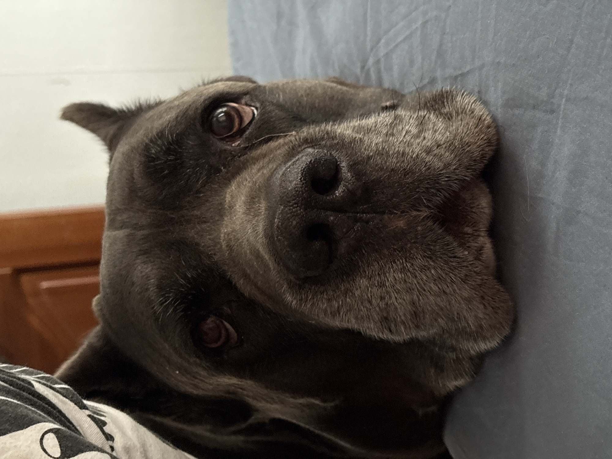 A close-up, slightly canted, medium-shot of a gray-colored Cane Corso dog's head resting on a light-blue bed sheet, with a partial view of a person's shirt with black and white stripes and circular patterns on the left