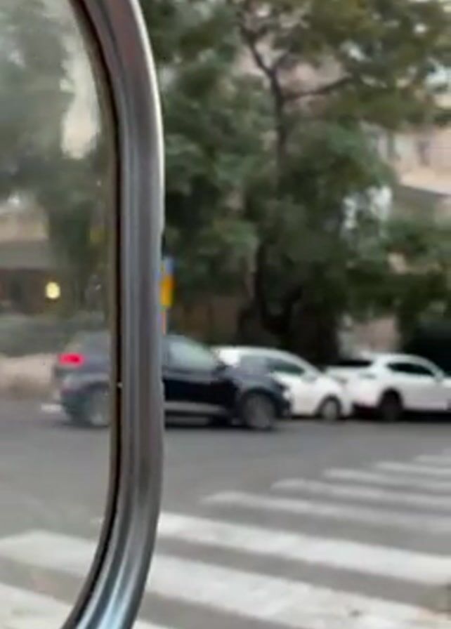 n out-of-focus street scene through what appears to be the window of a moving bus or train. The view includes parked cars (black and white vehicles are distinguishable), a crosswalk, street signs, and trees. The focus is shallow, concentrating primarily on the window frame.