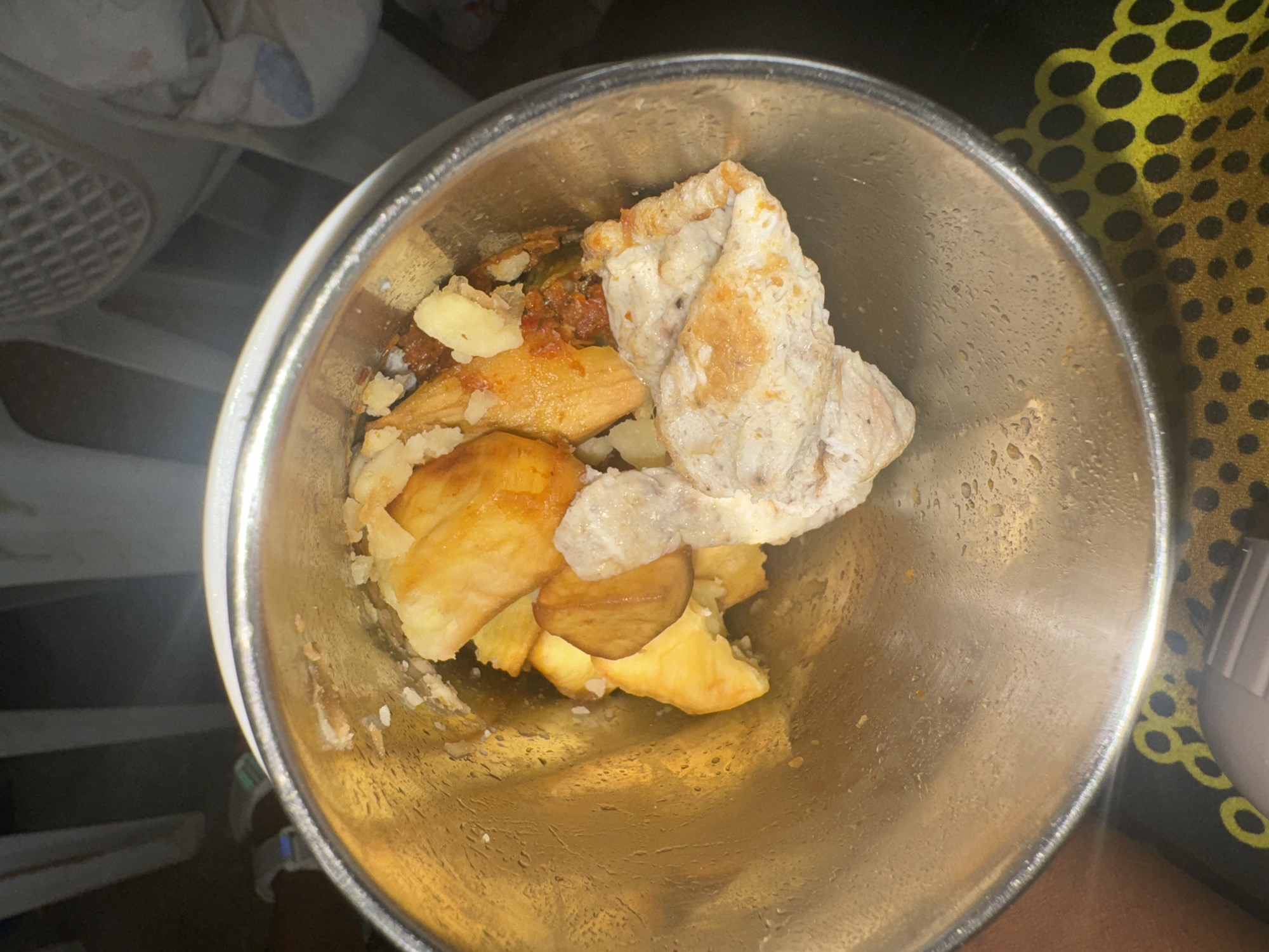 A top-down shot shows a stainless steel bowl filled with food. The bowl contains potato wedges, a tomato-based sauce, and pieces of chicken covered in a white sauce. The environment includes part of a white plastic fan in the background and a yellow and black patterned surface. The photograph appears to be taken indoors. There is no verifiable evidence of the image being taken in Barnawa, Nigeria. No people or actions are visible in the image.