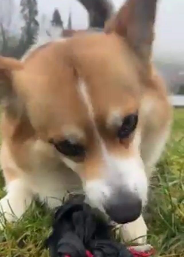 A tan and white Corgi dog is outside on a grassy area. The dog is tugging on a black glove or piece of clothing held by someone out of frame. The dog's leash is red. The camera moves close to the dog's face. The dog looks up, barks once, and then is panting. The background includes trees, grass, a street light, and other buildings on a slightly overcast day.