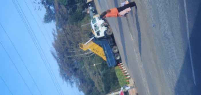 A truck is parked on the side of the road. The truck is white and has a yellow rear section which is elevated in the air. A person stands beside the vehicle. There are road dividers in the foreground of the image. Wires are visible running along the top left of the frame and trees are visible in the background.