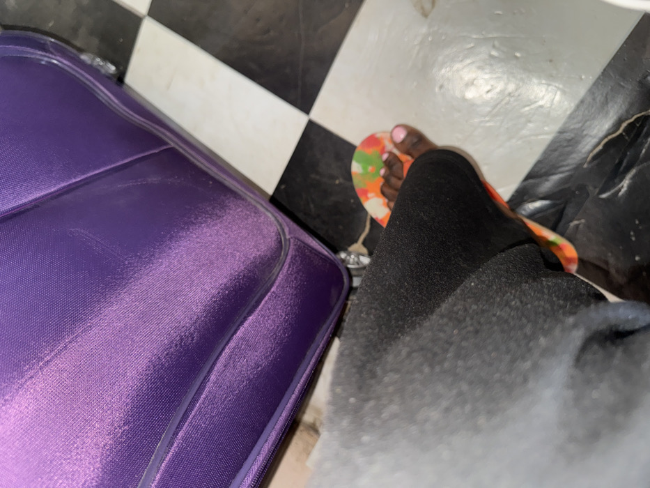The scene depicts a partial view of a purple, fabric-covered rolling suitcase and a human leg/foot on a black and white checkerboard tiled floor, located in Jos, Nigeria