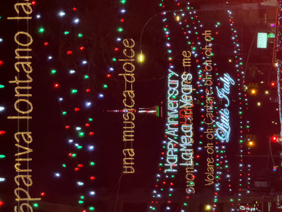 Strings of lights spell out Italian phrases and English translations in a festive display. The phrases include "Spariva lontano la," "una musica dolce," "Happy Anniversary," "suonbaMeLaat Mears me," "Volare oh oh Cantare oh oh oh oh," and "Little Italy." The lights are strung vertically, creating a colorful and celebratory atmosphere. Small red, green, and white lights flank the illuminated phrases.