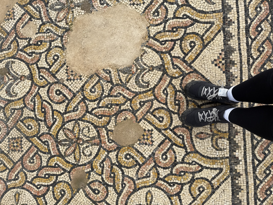 An overhead photograph captures the lower legs and feet of an individual standing on an ancient mosaic floor, located within the Mate Yehuda Regional Council, Israel