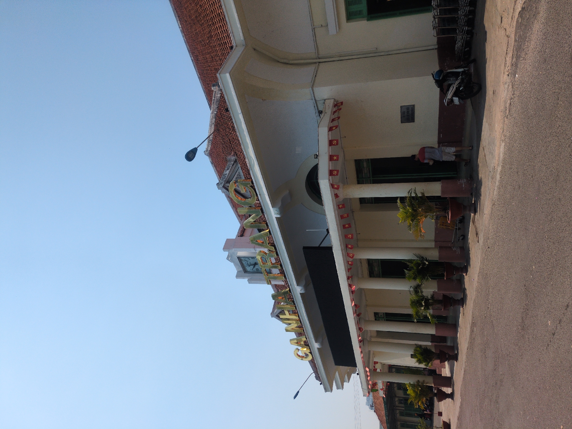 An eye-level view of the Nha Trang Train Station in Tây Nha Trang, Vietnam, under a clear, pale blue sky. The station is predominantly white with a red-tiled roof and a row of columns. Vietnamese flags are strung along the front edge of the roof. Gold lettering spells out "GA NHA TRANG" above the entrance. Along the pavement in front of the building, there are potted plants and a motorcycle parked to the side of the building. A man wearing a red-striped shirt and khaki shorts is standing near one of the entrances. The pavement appears to be asphalt and is in front of the building.