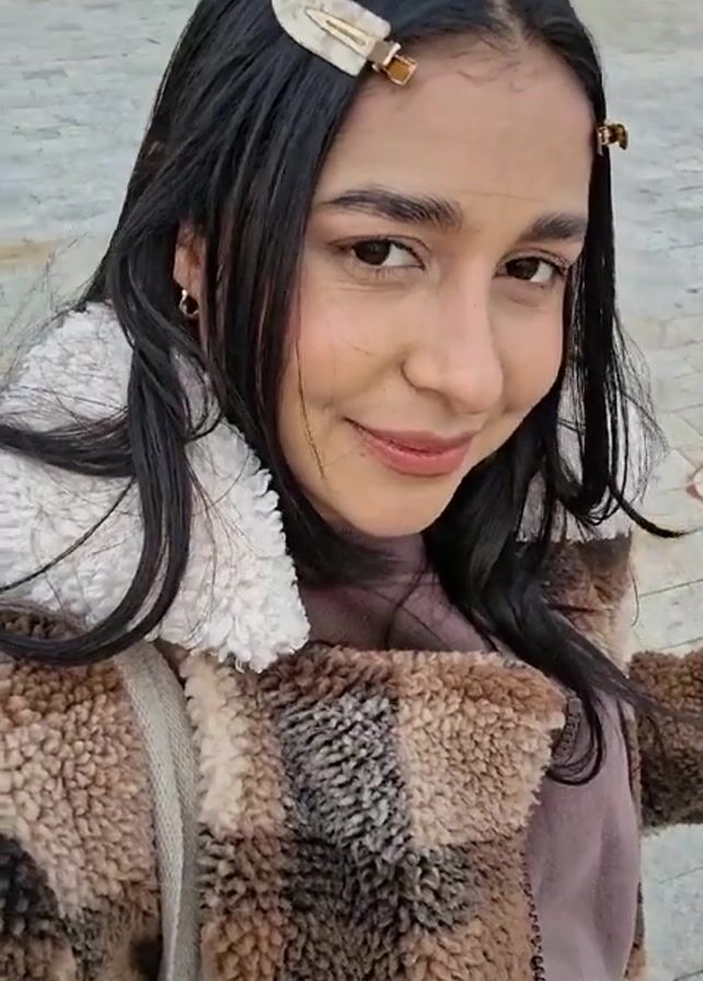 A young woman is standing outside and looking at the camera