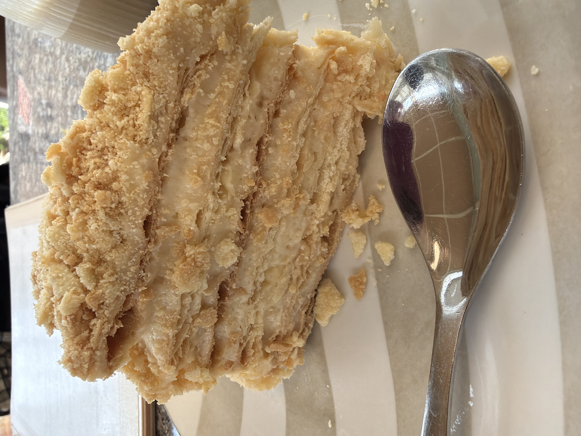 The image presents a close-up view of a single slice of multi-layered cake, resembling a Napoleon or Mille-feuille, positioned on a ceramic plate. The cake consists of approximately five to six visible horizontal layers of flaky pastry, separated by thick strata of pale yellow cream filling. The top surface and visible sides of the cake are covered with light-colored, fine pastry crumbs; several crumbs are detached and rest on the plate. The plate displays a pattern of alternating wavy stripes in light beige/grey and white. A silver-toned metal spoon, exhibiting surface scratches and reflections of the surrounding environment, lies horizontally on the plate in front of the cake. The background is out of focus, showing a white document or menu on a light-colored surface to the upper left, and a translucent beverage container to the upper right. Distant, indistinct elements in the background suggest an outdoor or semi-outdoor commercial setting. The scene is located in the city of Rishon LeZion, Israel.