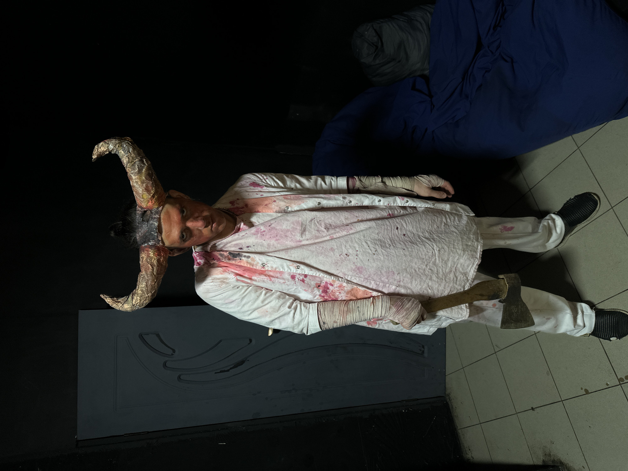 A person in a costume resembling a demonic butcher stands indoors holding an axe