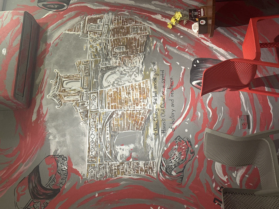 The image displays an interior wall featuring a vibrant mural. The central subject of the mural is a stylized depiction of Ô Quan Chưởng, identified by accompanying white text as "the last ancient gate of Hanoi's Old Quarter, a symbol of history and resilience," thereby locating the scene in Hà Nội, Vietnam. The gate is rendered in grey, white, and brown tones, featuring an arched entryway and a multi-tiered roof structure. The background of the mural consists of dynamic red and white brushstrokes on a grey base. Additional stylized elements within the mural include a sandal in the upper left and a crocodile head in the lower left, both integrated into the red and white patterns. Above the mural, a grey rectangular air conditioning unit is mounted on the wall. In the lower foreground, a grey mesh-patterned chair and a red mesh-patterned chair are partially visible. A small, round, dark brown table on the right holds a black tissue dispenser containing white tissues, a small vase with yellow artificial flowers, and a small rectangular promotional item. A grey power outlet is visible on the wall between the chairs.