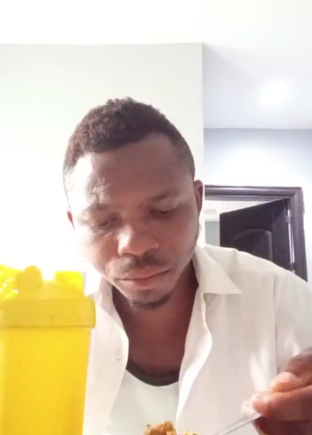 A man is eating from a brown bowl with a spoon. To the left of the bowl is a yellow shaker cup. The man has short, dark hair and a beard. He is wearing a white, button-up shirt. He looks directly at the camera as he eats. The background is a plain, white wall with a dark-colored door visible in the upper right corner. The scene is brightly lit.