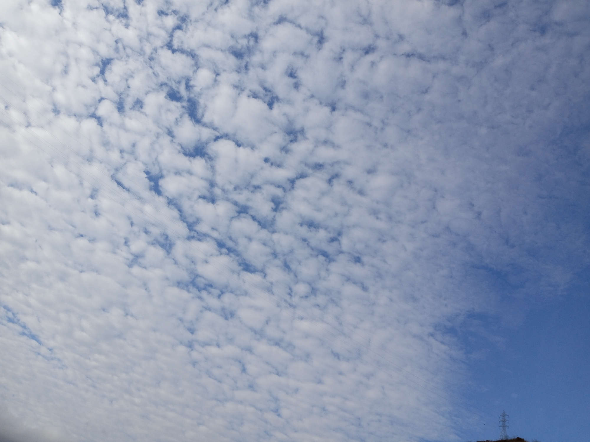 The image is a daytime shot of a sky partially covered with altocumulus clouds