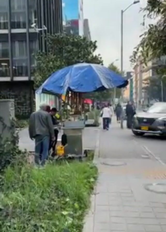The video captures a street scene in what appears to be a city. In the foreground, there is a food vendor under a blue umbrella, serving customers. A few people are gathered around the cart. A gray SUV drives by on the street. The sidewalk is paved and bordered by a patch of overgrown greenery. Behind the vendor, pedestrians are walking along the sidewalk. In the background, there are tall modern buildings. The sky is overcast.