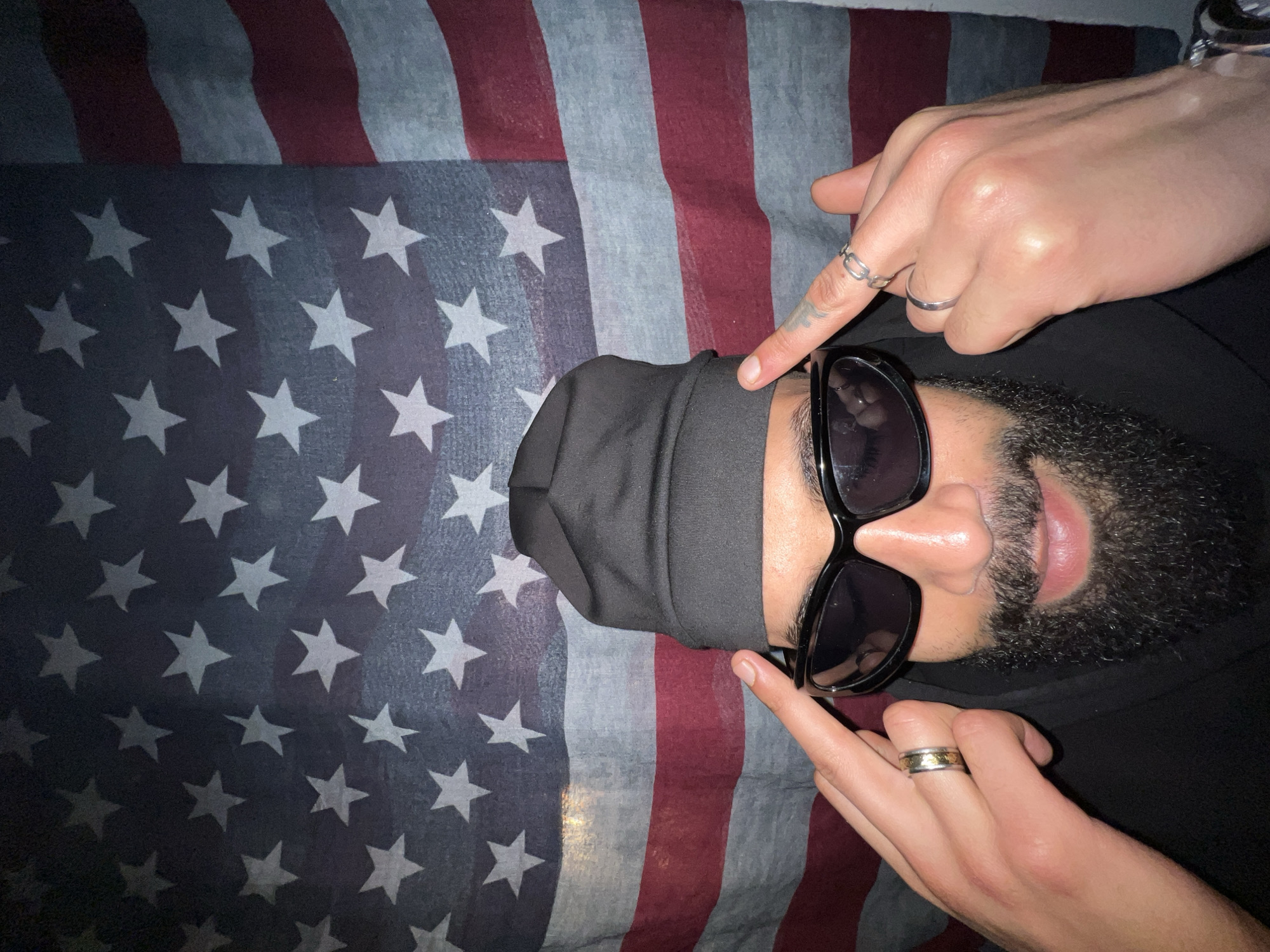 A man lies on an American flag with a dark beanie covering his forehead. He wears sunglasses and has a beard. Both hands are raised, index fingers pointing towards the sunglasses. One hand has two rings and a small tattoo. The other hand has a gold ring. No information about the location in Tanger, Morocco is apparent in the image.