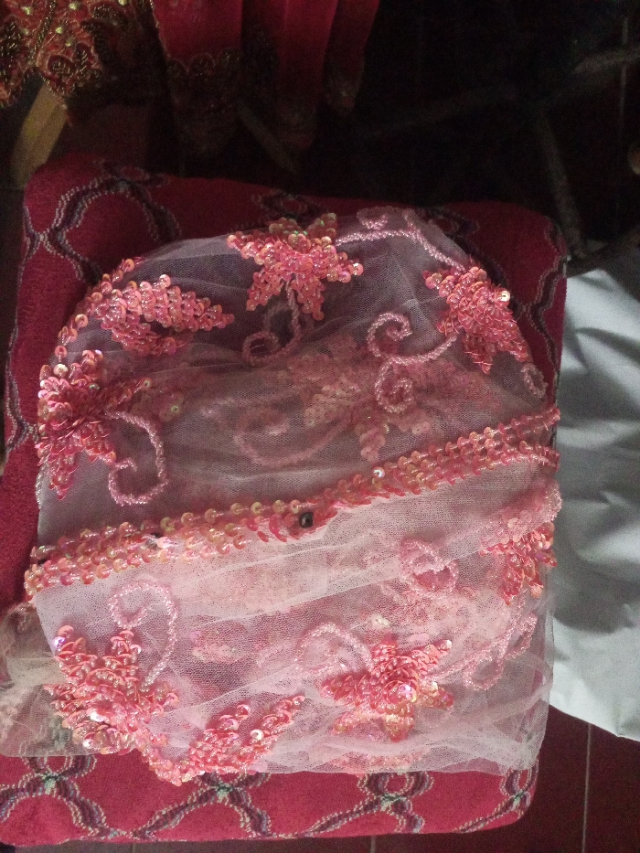 This image, captured in Bamhori, India, presents a static, overhead view of a light pink, semi-transparent fabric, possibly tulle or netting. The fabric is intricately embroidered with numerous pink sequins forming distinct floral or leaf-like patterns and swirling motifs. It is draped over a darker red textile surface that displays a repetitive, grid-like pattern of interwoven lines in a slightly darker hue. In the upper background, additional draped red fabric with subtle embellishments is partially visible, while a plain, light-colored fabric occupies the right edge of the frame. No individuals, direct actions, or interactions are present in the scene.