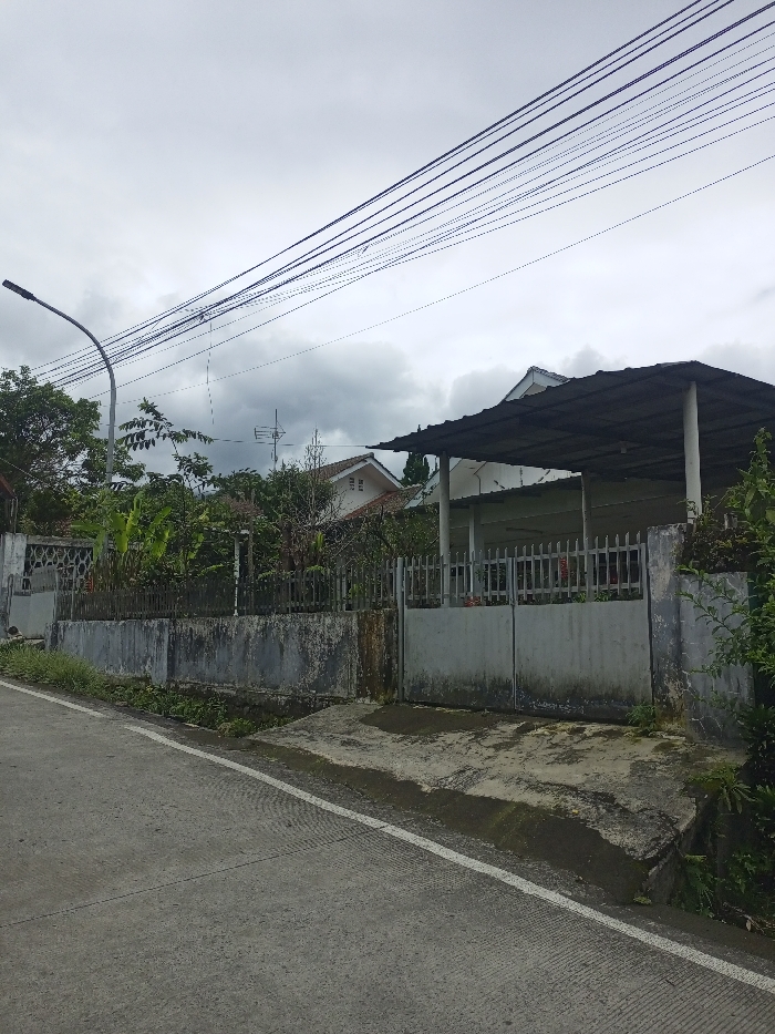 The scene depicts a residential street in Meyong, India, under an overcast sky. The foreground features a concrete road with a single white lane marking running parallel to a concrete curb. Adjacent to the curb is a visible drainage channel. Behind the curb, a weathered concrete retaining wall, approximately 1 meter high, runs horizontally across the image, topped with a dark metal fence. Mid-ground elements include a closed double-panel metal gate, approximately 1.5 meters high, integrated into the fence line, leading to a property. Dense green vegetation, including banana plants and various trees, is visible behind the wall and fence, partially obscuring the structures beyond. In the background, two residential structures are discernible. To the right of the gate, a white-walled house with a large, dark-colored corrugated metal carport or porch roof, supported by light-colored columns, is visible. Further left, partially obscured by foliage, another house with a light-colored gabled roof and white or light-toned walls is present. Overhead, multiple black electrical or communication lines span diagonally across the frame from left to right. A curved street light pole with a black luminaire is positioned on the far left. A television antenna structure is also visible on a rooftop or pole amidst the background foliage. No individuals or active subjects are present in the image.