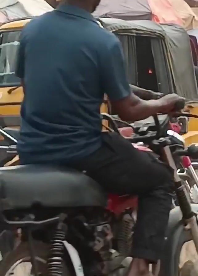 street scene. There is a yellow auto rickshaw with black curtains parked on the side of the road. A man wearing a white construction hat and a striped shirt sits on a red motorcycle next to the rickshaw. The man on the motorcycle wears gray pants and sandals. In another scene, a man wearing a white T-shirt and red shorts rides another motorcycle. The video shows the auto rickshaw again with a person walking by.