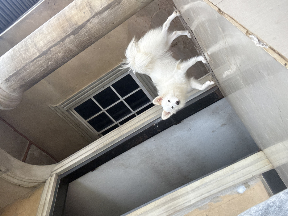 The image depicts an exterior or semi-exterior portion of a building in Ikot Ekpene, Nigeria. A single white dog, consistent with a Spitz-type breed due to its dense fluffy fur, pointed ears, and curled tail, stands on a light-colored, reflective tiled floor. The dog is positioned slightly right of the frame's vertical center, its head turned directly towards the viewer, displaying a black nose and dark eyes. Its posture suggests motion, with the right front paw slightly raised. A faint reddish-brown mark is visible on its right front leg. Architectural elements dominate the background. A substantial, light brown, vertically striated column is visible on the far right, extending from the bottom to the top of the frame. To the left of the dog, an open dark doorway reveals a plain grey wall within. Another similar column partially frames the left side of this doorway. Above the dog, a light brown wall section features a rectangular window with white mullions forming a grid pattern (three horizontal, two vertical panes visible). The window has a decorative, molded trim along its top edge. Overhead, an arched structure connects the visible columns. The floor exhibits minor surface irregularities, including a distinct crack towards the bottom right. The scene is illuminated by ambient light, causing reflections on the polished floor tiles.