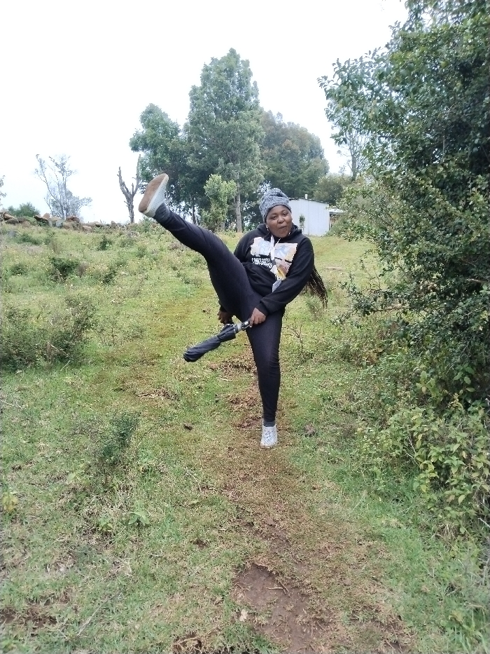 A female individual stands on a dirt path in a vegetated outdoor environment. She is wearing a grey knitted beanie, a black hooded sweatshirt with a multi-colored graphic design, black pants, and light-colored low-top sneakers. Her right leg is extended horizontally to her left in a kicking motion, with the sole of her shoe visible. Her left foot is planted on the ground. She holds a closed black umbrella in her left hand. The subject has an open-mouthed expression and is looking directly at the viewer. The surrounding area consists of green grass and various shrubs. In the mid-ground, multiple green trees are visible, along with a small white building with a dark roof to the right of the center. The sky is overcast and light grey. The scene depicts a natural landscape, likely a field or hillside, in Unknown, Kenya.