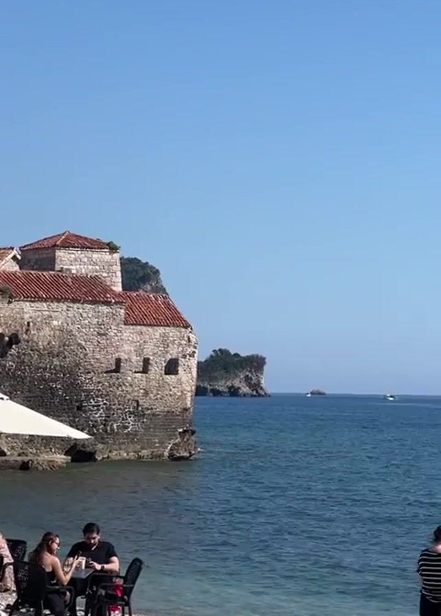 bright, sunny day at a pebble beach, with a clear blue sky and calm, blue sea. In the initial scene, a restaurant is situated on the beach next to an old, stone building with red-tiled roofs. People are seated at tables under a large, white umbrella. As the video pans right, it shows more of the beach where several people are standing near the water's edge. Some are taking photos with their phones. Several boats are visible in the distance on the water. The overall scene is a tourist destination on a beautiful day.