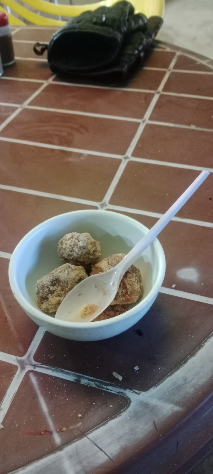 A small, white bowl on a brown tiled table contains four brown, spherical objects with a rough, textured surface. A white plastic spoon rests inside the bowl, its concave part holding small brown crumbs. Behind the bowl, slightly out of focus, is a black object, possibly a glove or a pouch. The table shows wear and tear, with visible scratches and debris.