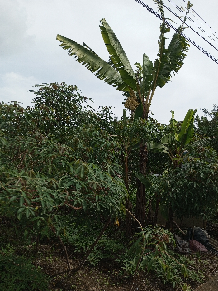 The image displays an outdoor scene in Cibadak, Indonesia, characterized by dense tropical vegetation under an overcast, light grey sky. A prominent banana tree, centrally located, extends upwards and bears a cluster of light-colored bananas midway along its trunk. Additional banana trees with large green leaves are visible, particularly in the midground. The foreground and midground are heavily populated by numerous cassava plants, identifiable by their distinctive palmate, dark green leaves. Dark utility lines are visible against the sky in the upper right portion of the frame. The ground consists of dark soil with scattered smaller green plants. In the lower right corner, a small collection of miscellaneous discarded items, including what appears to be corrugated metal and dark fabric, rests on the ground. No people are present.
