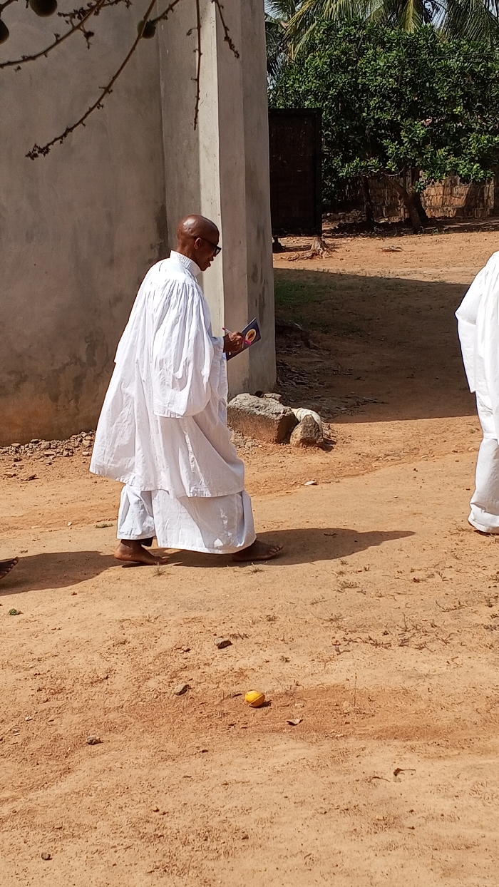 In Egbedi, Nigeria, a bald individual, wearing dark sunglasses and a multi-layered white garment, walks barefoot from left to right across reddish-brown sandy terrain under bright daylight. The individual holds a small, colorful pamphlet or book in their right hand. A second person, partially visible on the far right, wears similar white attire. A small, yellow spherical object rests on the sand in the foreground. A weathered light-colored concrete wall borders the left, featuring a dark rectangular opening in the mid-background. Dense green foliage and palm fronds are visible behind the wall. An overhead branch with dark, round fruits or pods extends into the upper left. Strong sunlight casts sharp shadows to the left.