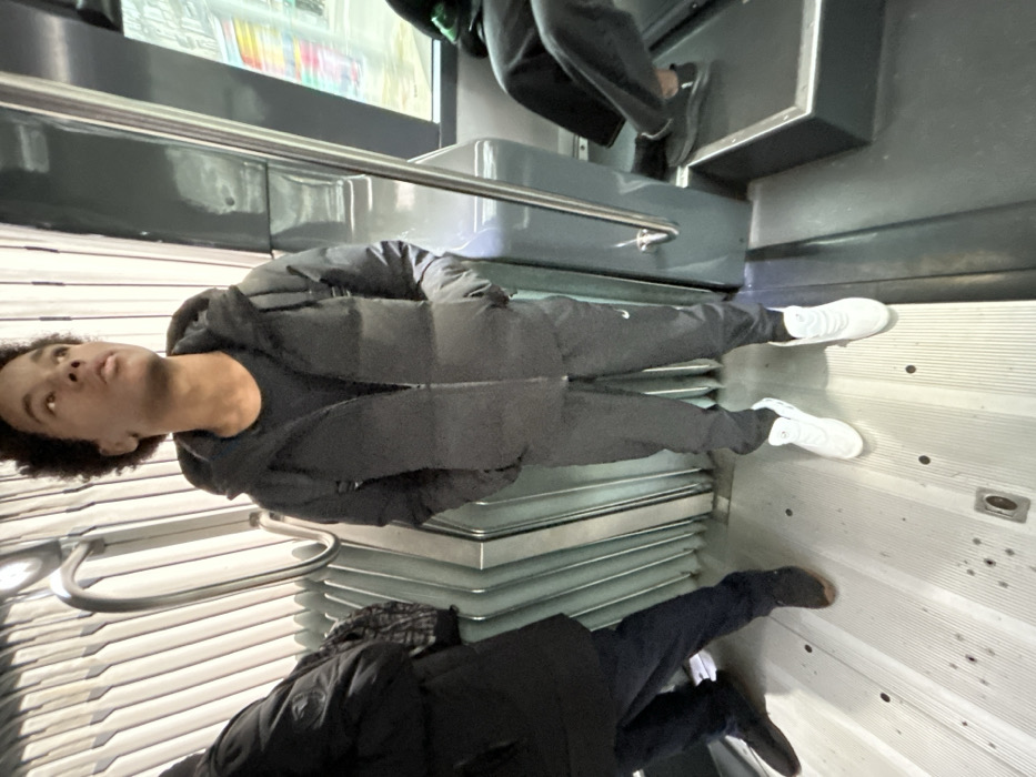 The image depicts the interior of a public transport tram in Strasbourg, France. A young male with dark skin and dark, curly hair stands centrally, facing slightly to the right with an upward gaze. He wears a black hooded puffer jacket, a black t-shirt, black tracksuit bottoms with a white Nike swoosh on the left thigh, and white athletic shoes. His hands are in his jacket pockets. To the left, a person is partially visible, wearing a dark jacket, dark trousers, and dark shoes; a patterned backpack is positioned behind them. To the right, a seated individual is partially visible, wearing dark trousers and dark shoes, with a green element of clothing near the window. The tram interior features a light-colored, grooved floor with dark circular markings, grey articulated wall panels, a silver vertical grab pole, and grey horizontal handrails. Large windows on the right reveal blurred street details and colorful signage, indicating the vehicle is in motion within an urban environment.