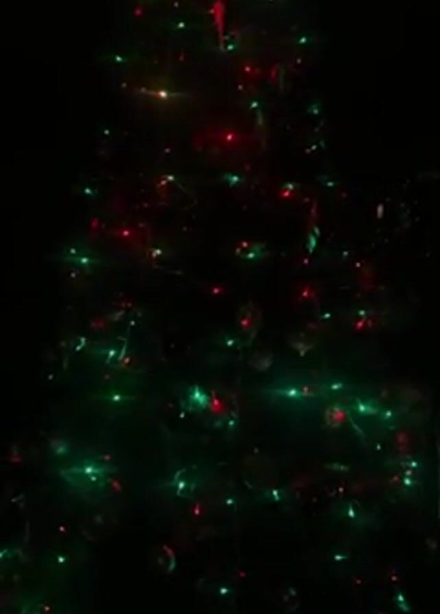 Christmas tree in a darkened room. The tree is adorned with multicolored lights: green, red, and blue. The lights are twinkling and blinking on the tree. There are also some visible ornaments on the tree. The room is otherwise dark, with only the Christmas tree providing illumination.