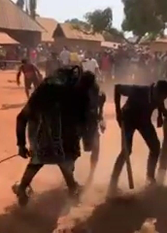 The video depicts a cultural performance in a village setting. A central figure, possibly a dancer or performer, is dressed in an elaborate, dark, patterned costume, surrounded by several people who appear to be dancing or moving in a coordinated manner. The scene takes place on a dusty, reddish-brown dirt ground, kicking up dust with their movements. In the background, a crowd of onlookers is gathered, and there are several small, simple buildings with straw or clay roofs, typical of a rural village environment. The overall impression is that of a traditional cultural event or celebration.