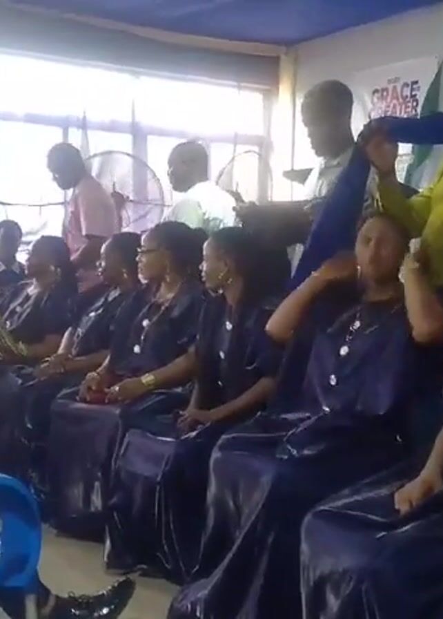 The video captures a moment in what appears to be a church gathering. A group of women dressed in matching blue dresses sit in chairs, likely a choir or a similar organized group. Several men are standing around them, with some appearing to adjust or present clothing items, perhaps garments for a performance or a special event. There is a small child sitting in a blue plastic chair to the left of the screen, observing the activity. A banner with the words "Grace Greatest Glory" is visible in the background. The environment is indoors, with a ceiling covered by a blue tarp or cloth, and a fan is visible in the background. The overall atmosphere suggests a ceremonial or celebratory moment, possibly a dedication or recognition of the women involved.